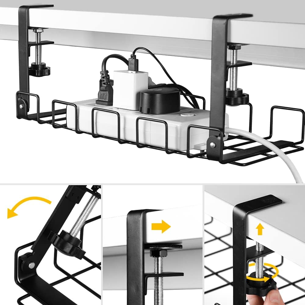 - The Foldable Cable Management Tray is the perfect solution for keeping your cables organized and out of sight. Featuring an innovative clamp mounting system, this tray requires no screws or hardware to attach to your desk frame. With a simple rotating motion, it can be securely attached to frames measuring between 2 and 3.8 cm. Installation is a breeze - just lift up the foldable supporting arm, clamp the tray to your desk frame, and tighten. The open wire mesh design offers maximum flexibility, allowing cables to be brought in and out of the tray at any point. This package includes two trays, each measuring 40 cm in length, 16 cm in width, and 16.5 cm in total height. No more holes underneath your desk - get organized with the Foldable Cable Management Tray.