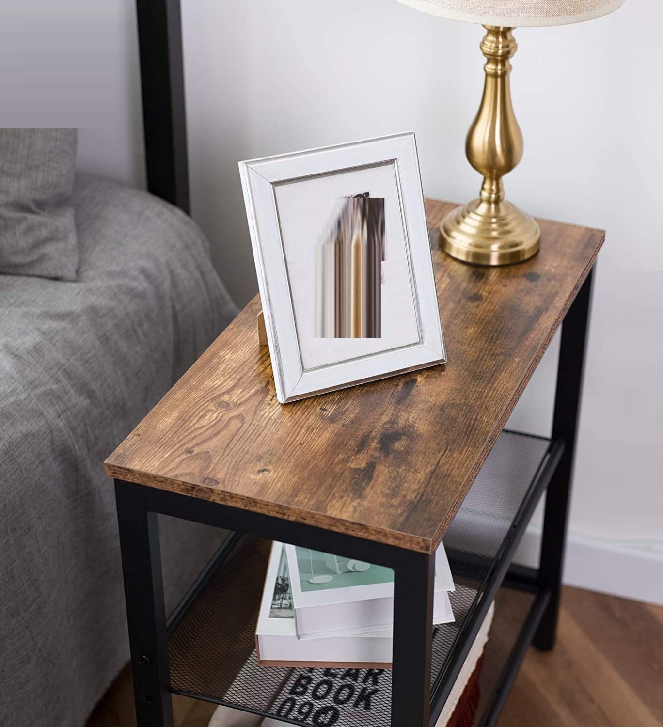 - Looking Different: This narrow end table choose to use the classic combination of black and brown - the wooden board in rustic brown, and both the metal frame and the linenette fabric storage bag are in black, this is a great bedside table you will like.