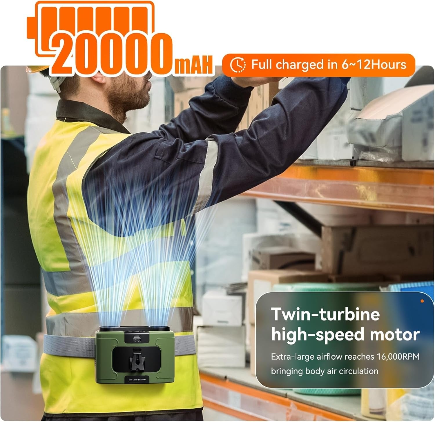 - 40H Long-lasting Cooling: This waist fan features a built-in 20000mAh rechargeable battery and a powerful motor, providing powerful but comfortable airflow. It can last up to 8-40 hours on a single charge. Perfect for use in jobsite outdoor garde