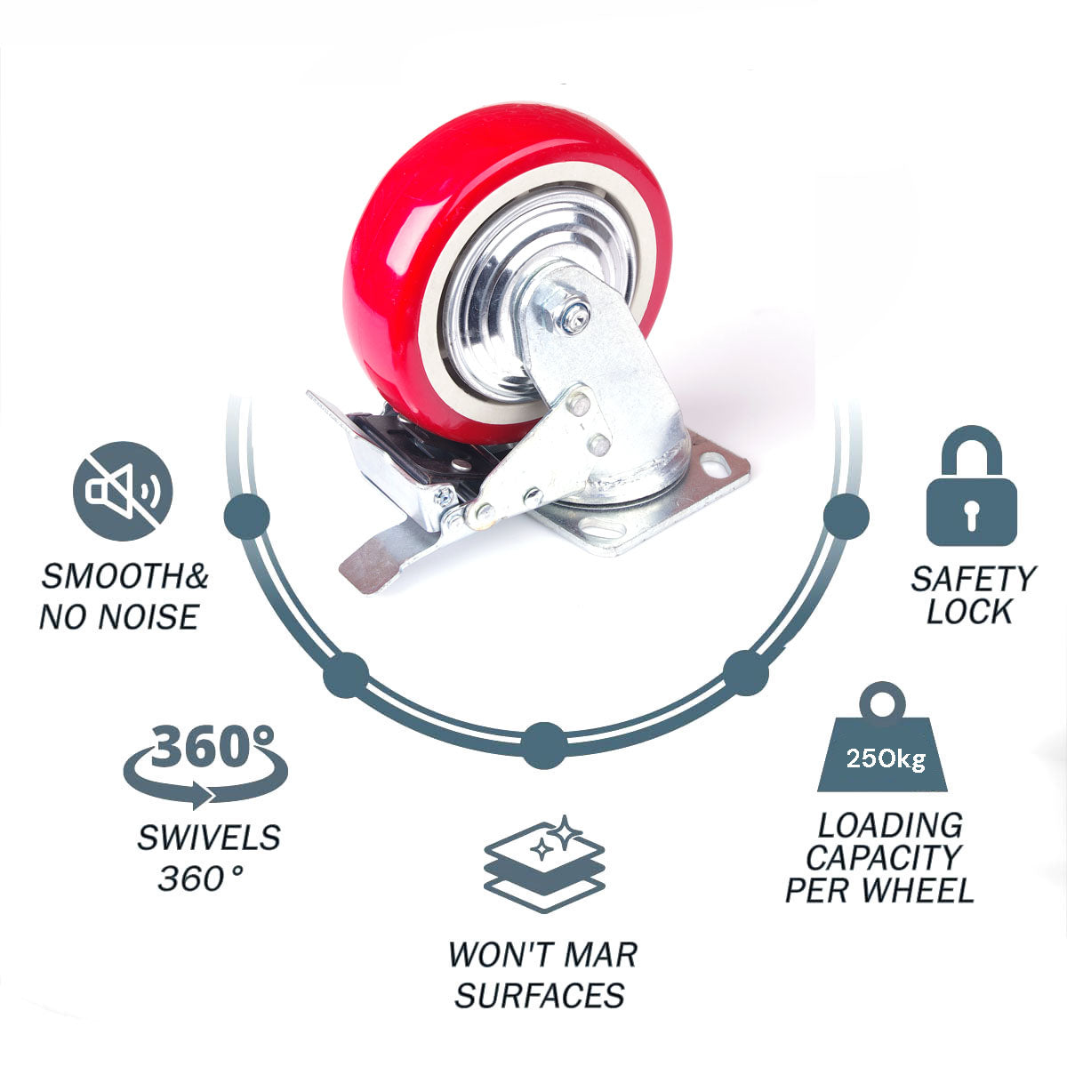 Castor wheels feature a top plate swivel, the wheels can rotate 360 degrees and transport heavy items smoothly from one place to another without leaving any traces on the floor