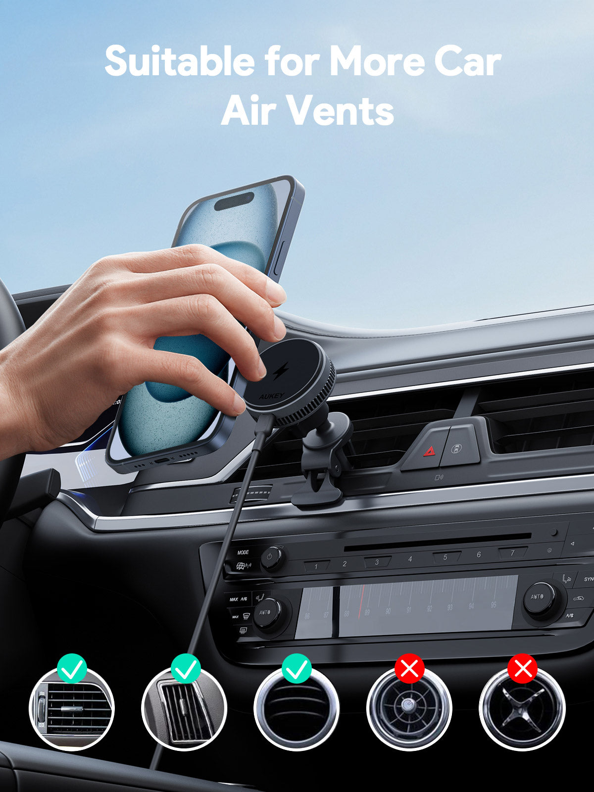 Aukey Wireless Car MagSafe Holder/Charger 15W (HD-MC13A) provides fast 15W charging with MagSafe compatibility for secure and convenient phone mounting, as well as a new cooling fan to prevent your phone from overheating.