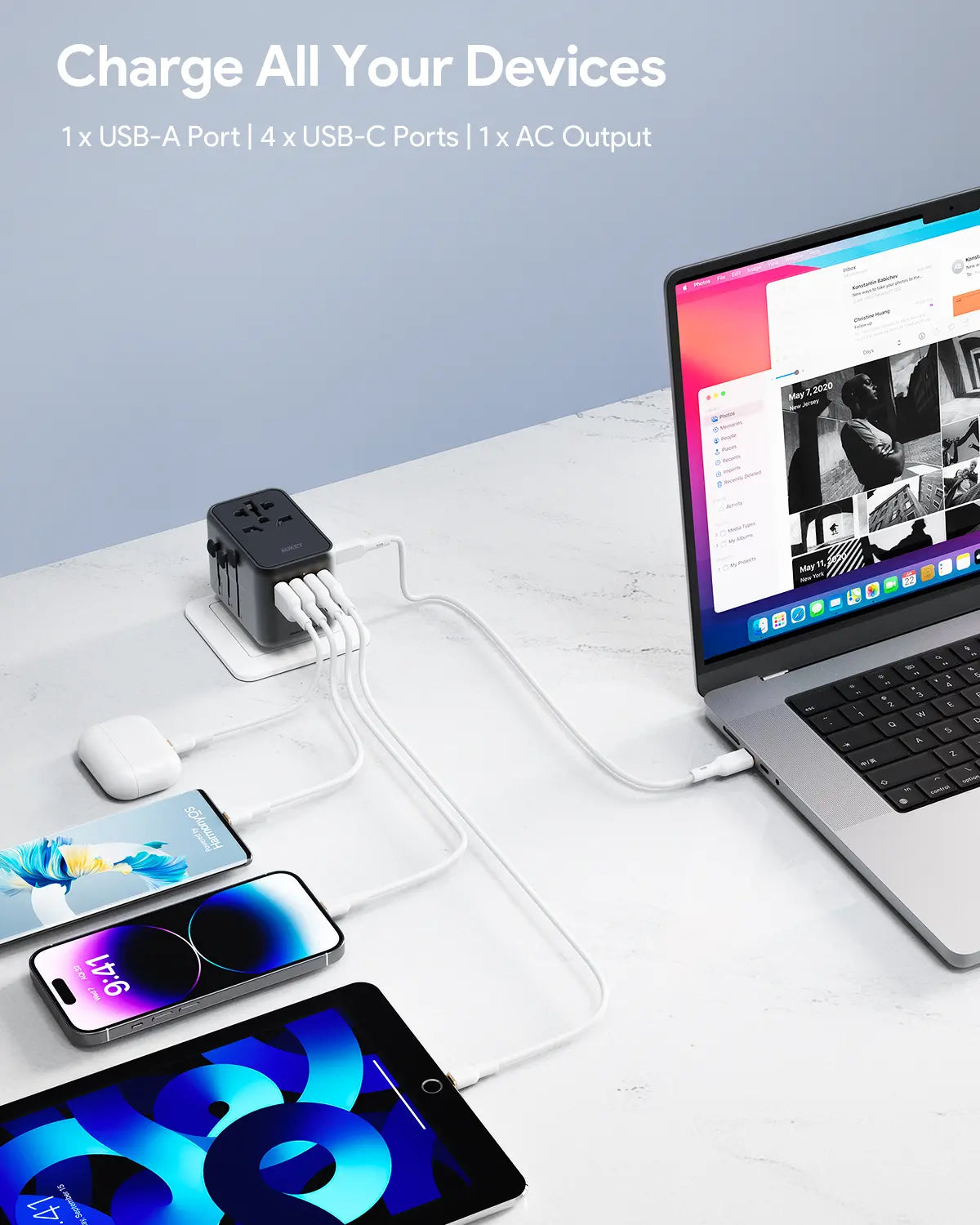 The Aukey Travel Mate Universal Adapter with 4 USB-C Ports 65W (PA-TA08A) is a versatile travel accessory that provides reliable charging in over 150 countries. With both USB-A and USB-C ports, it allows you to charge multiple devices simultaneously, including laptops, smartphones, and tablets. The 65W power output ensures fast and efficient charging, making it ideal for high-powered devices. Its compact design makes it easy to carry while traveling, and built-in safety features protect against overheating, overcurrent, and short circuits, ensuring safe and worry-free use.