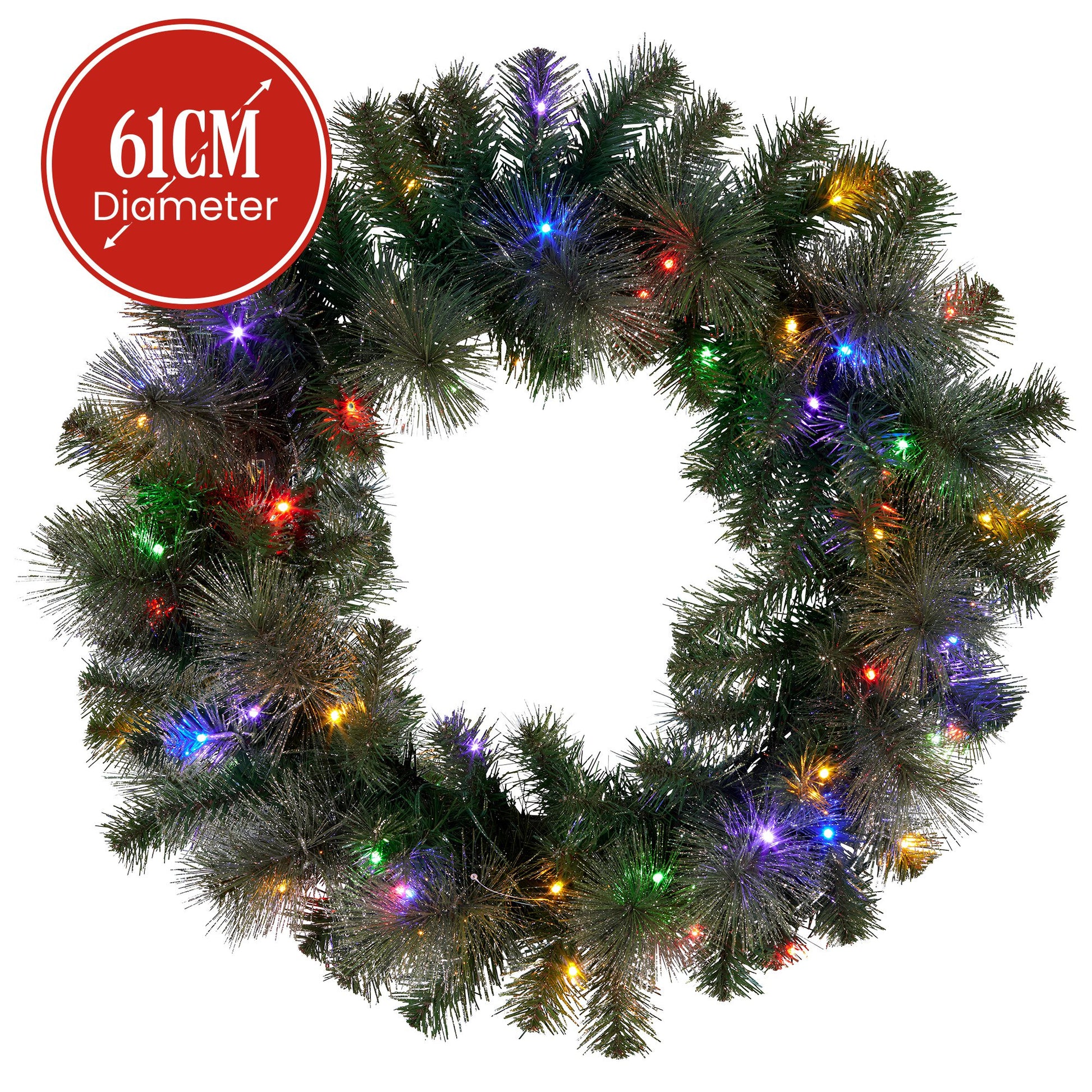 Give your holiday decor the gold-star treatment with this luxe Christmas wreath. Packed with full, glitter-kissed foliage and glowing with multi-function LED lights, its the perfect festive touch for your front door or wall. Choose white, coloured or mixed light settings, all powered by batteries with a handy timer. No cords, no hassle-just effortless Christmas cheer, ready to light up any space.