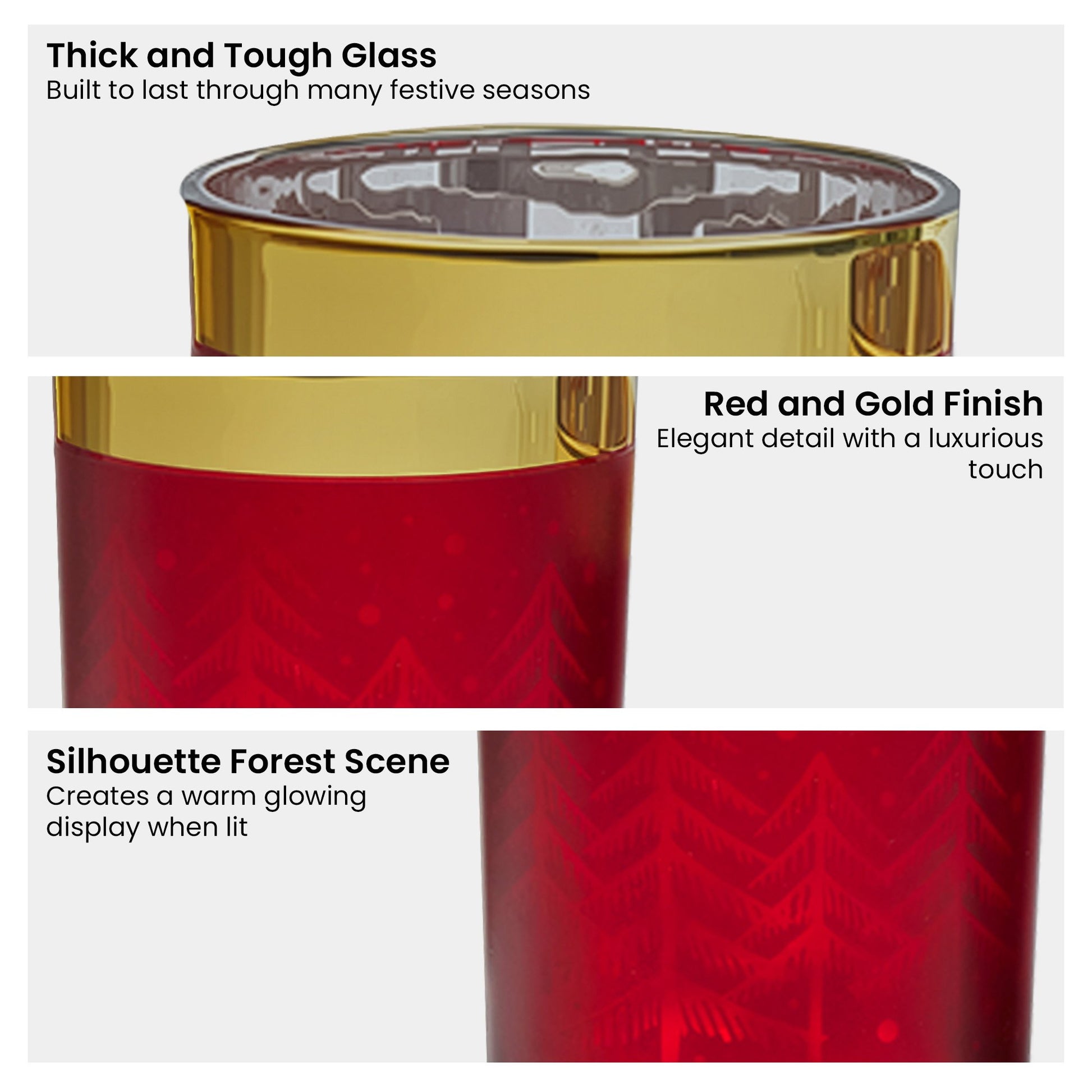 This set of 3 candle jars is crafted from thick, tough glass with a stunning red and gold finish and a gleaming silver interior.
