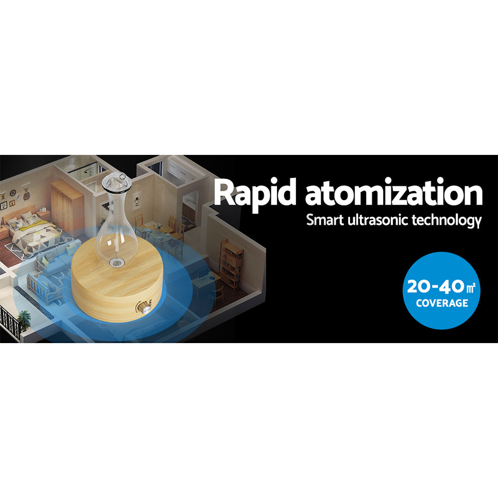 Relax and absorb calm and soothing vibes at the touch of a button with a Devanti Waterless Aroma Diffuser. The diffuser features a light wood base and a delicate hand-blown glass body that will last a lifetime of essential oil use. Delightfully aesthetic, the diffuser works in three ways: as a purifier, a night light, and an aromatherapy device. Unlike traditional diffusers, no heat or water is required: simply remove the cover, add your essential oils according to instructions, adjust the aroma intensity with the easy-to-use knob switch, then set and forget. The diffuser uses smart ultrasonic technology for rapid atomization and provides up to 40 square metres of coverage. Use intermittent nebulization to save your oils while maintaining a pleasant aroma, and rest assured you will save power with the 3-hour shut-off. The nebulizer operates silently, and you can automatically cycle through seven colours for a relaxing, decorative night light. Bring life back to stale air, cover stubborn odours, and revitalize your home with a Devanti Waterless Aroma Diffuser.