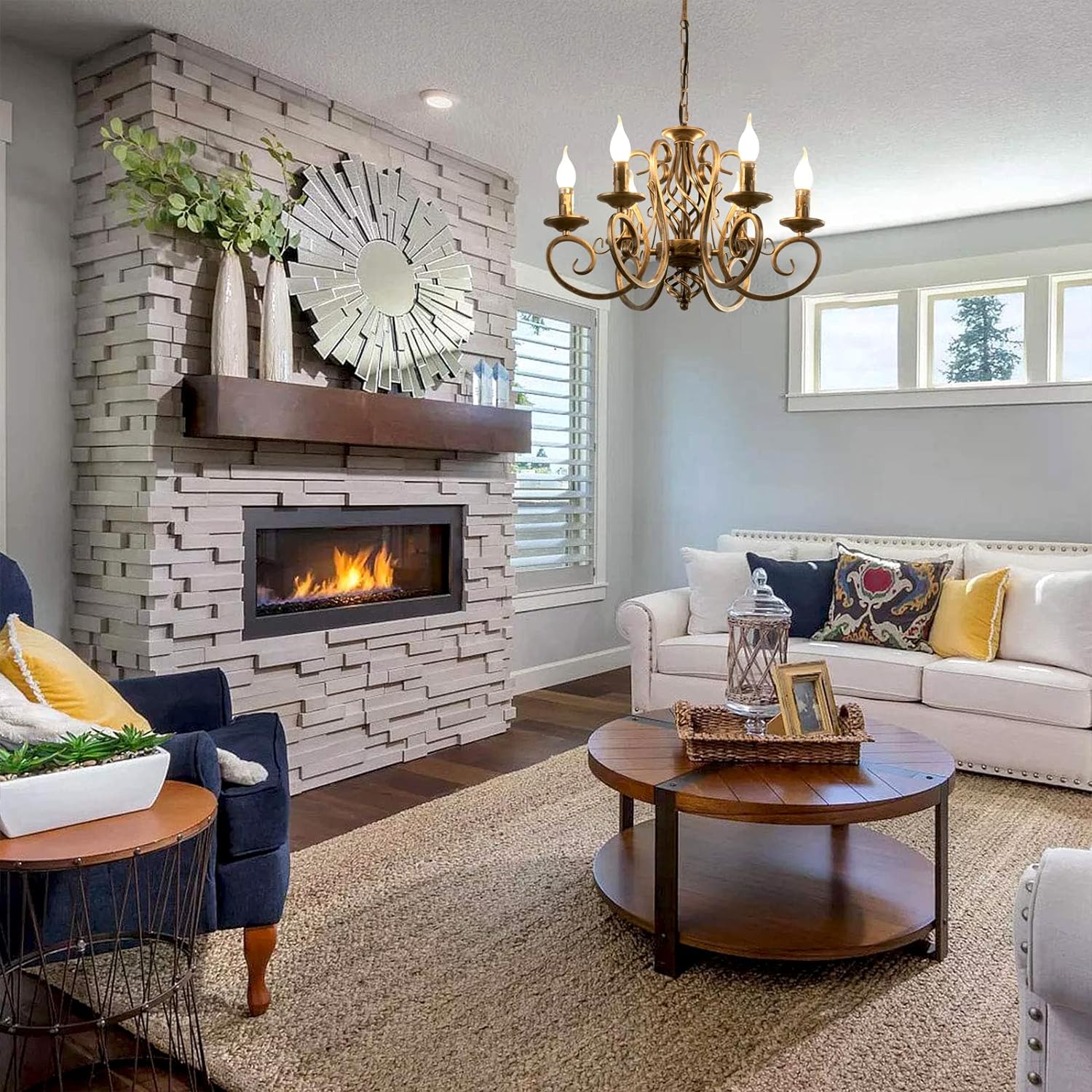 - Bring a modern twist to your home with this unique farmhouse chandelier. Crafted with a rustic black metal finish and curving arms, this light fixture will add an industrial-inspired style to any room. Perfect for entryways, living rooms, dining rooms, bedrooms, foyers, kitchens, and hallways, this chandelier will bring a touch of traditional charm to your home.